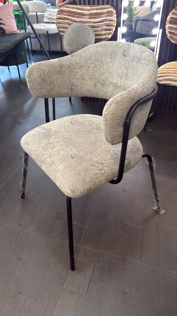 Modern Upholstered Dining Chair – Grey Fabric with Black Metal Legs. Curved backrest with integrated arm support