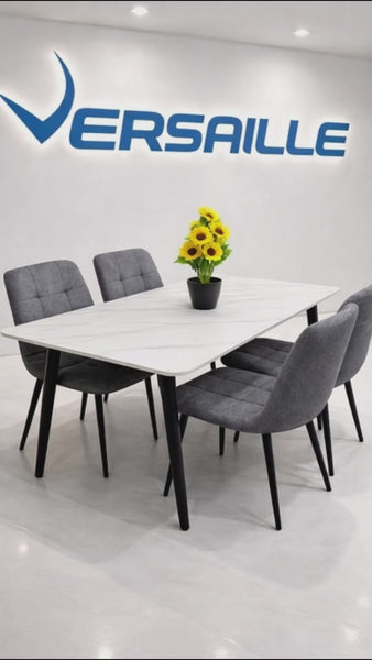 This dining set features a ceramic top table measuring 120 x 80 cm, providing a durable and easy-to-clean surface. Accompanied by four grey upholstered chairs with metal legs, this combination supports a modern aesthetic while ensuring stability. The fabric upholstery enhances comfort for extended dining sessions.