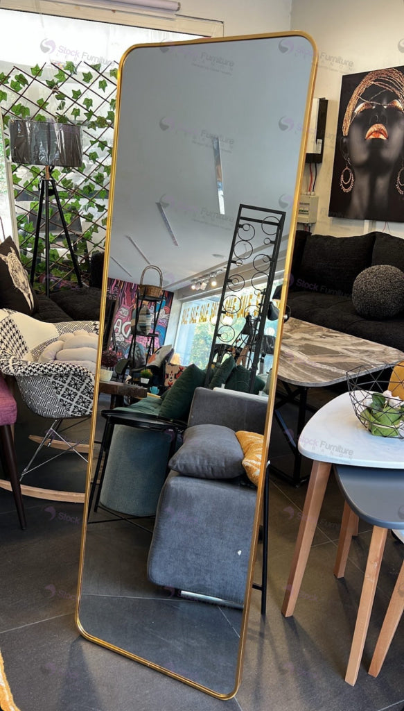 Add a touch of elegance and modern style to your space with this sleek standing mirror. Featuring a slim golden frame with rounded edges, it brings a sophisticated accent to bedrooms, dressing areas, or living rooms. The tall full-length design offers a clear reflection, perfect for daily outfits or enhancing the sense of space in your interior. Its sturdy stand allows easy placement without the need for wall mounting, making it both practical and decorative.160x45